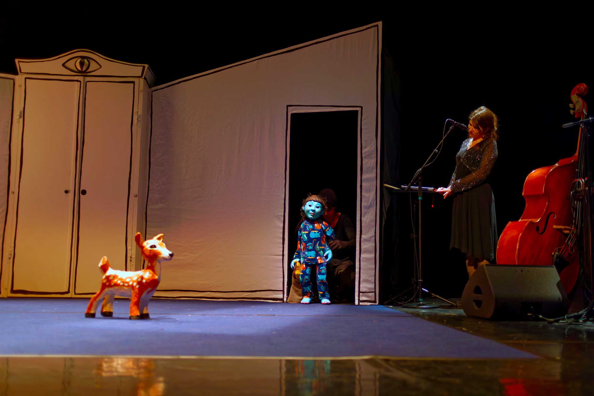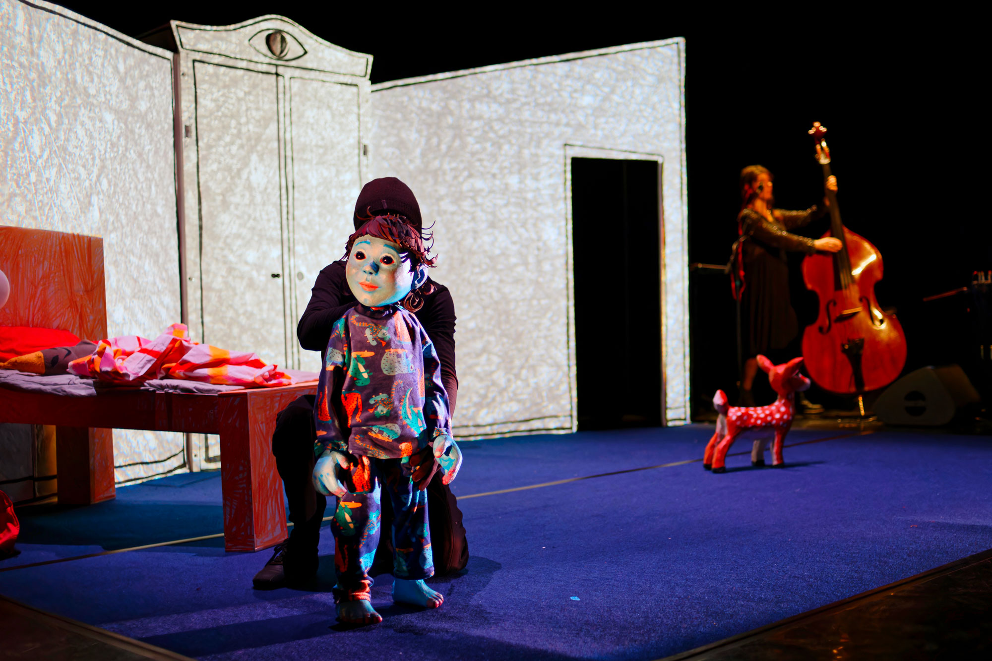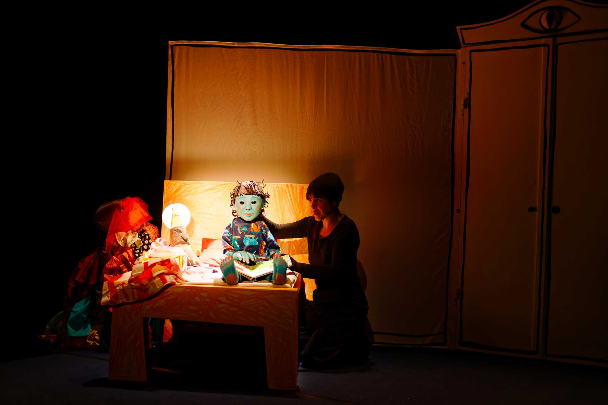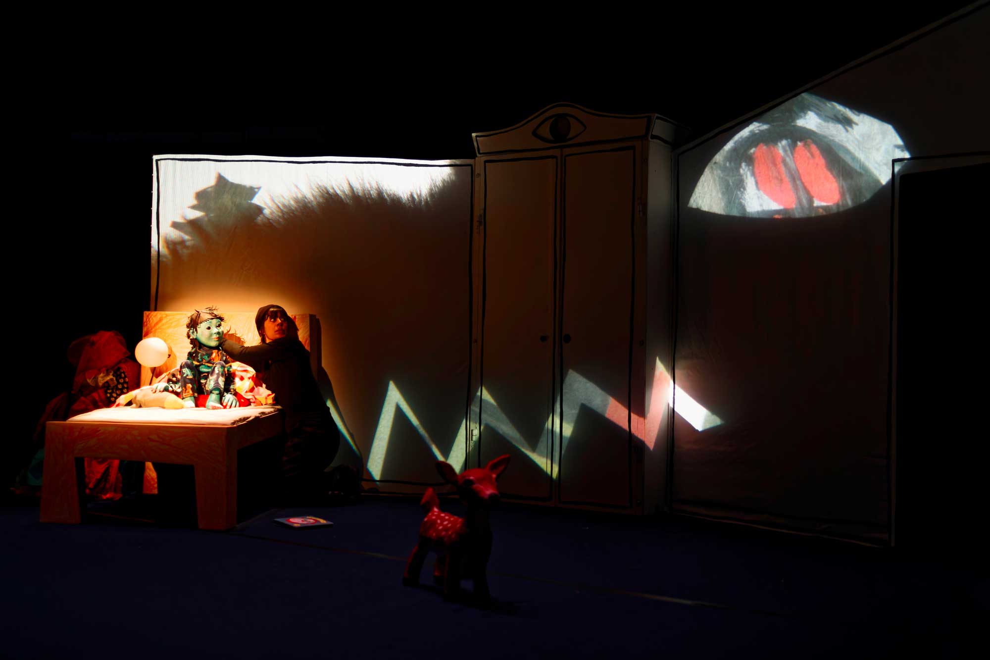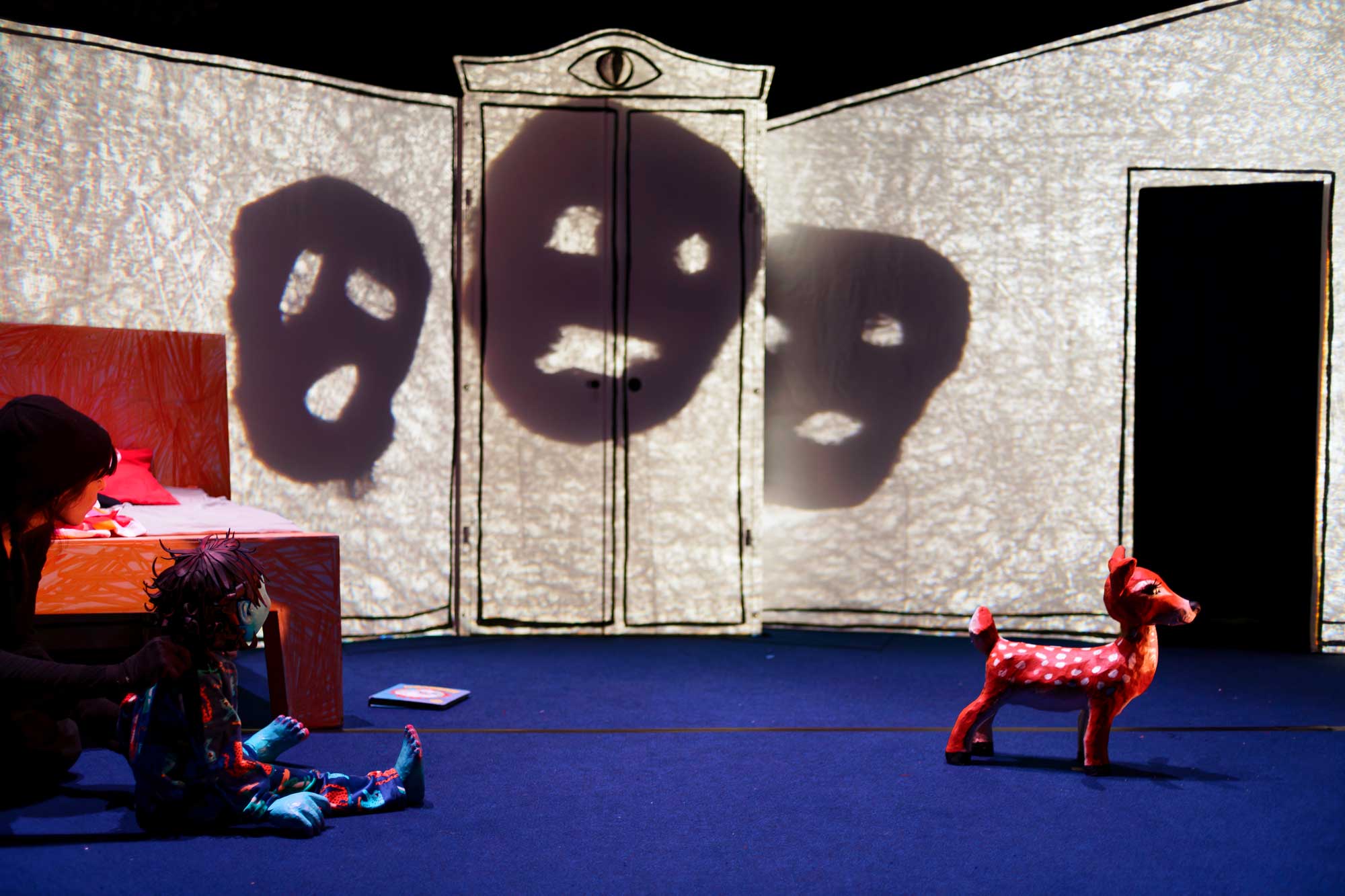 C’est donc dans un décor de chambre aux perspectives hasardeuses et au mobilier dessiné par les enfants (petit lit, immense armoire, coffre à jouets et fenêtre), que des murs gourmands vont faire disparaitre et apparaitre des visions.